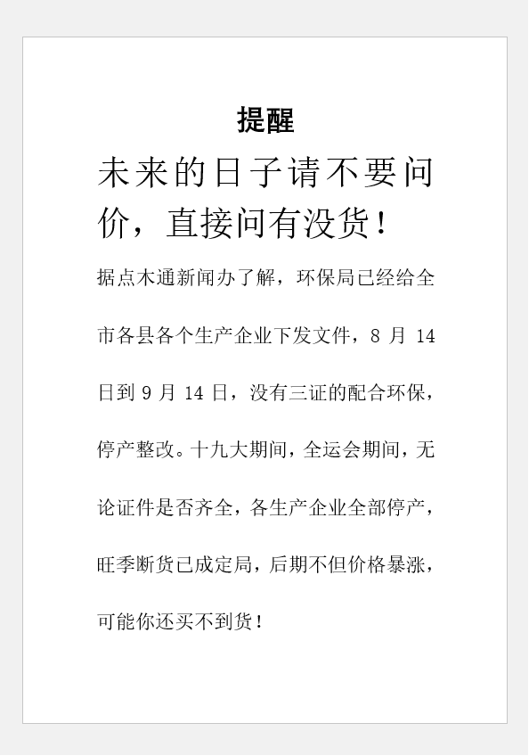 除此之外,还有今日网上一直疯传的:“未来的日子请不要问价,直接问有没货”的帖子在朋友圈疯传,都是关于材料涨价,且与环保关停、限产有关