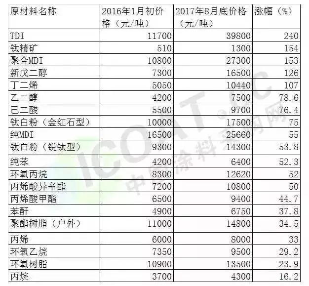 ▲部分大宗化工品涨幅对比,来自中国涂料采购网