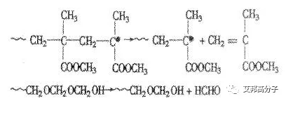 解聚反应系先在大分子未端断裂,,然后按连锁机理迅速脱除单体,在聚合上限温度以上尤其容易进行。现以聚甲基丙烯酸甲酯与聚甲醛的解聚反应为例,其自由基脱除单体的反应如下: