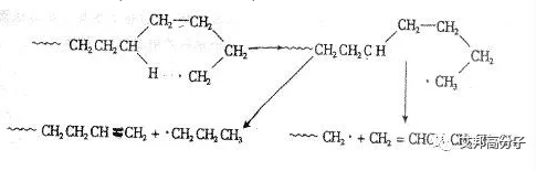 对于诸如PE等聚合物在高温成型时,其主链任何位置都可能断裂,分子量迅速下降,但单体收率很少,这类反应称作无规断链,有时也称作降解,聚乙烯断链后形成的自由基活性很高,四周又有较多的二级氢,易发生链转移反应,几乎无单体产生,其基理如下: