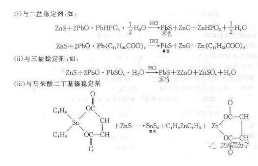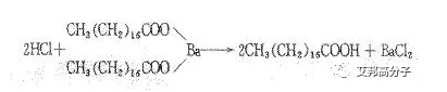 PVC在热加工时须加百分之几的酸吸收剂,如硬脂酸钡、有机锡、铅化合物等,以提高其稳定性。以硬脂酸钡为例,反应式如下: