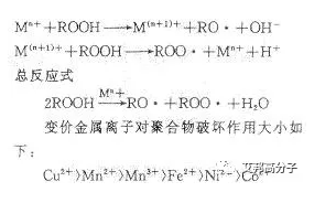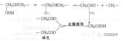 氢过氧化基团引起的链的断裂导致分子量降低,其均裂的主产物为醇、醛、酮,最后氧化成羧酸。羧酸对金属催化氧化起着主要作用。
