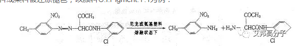 某些高聚物,如尼龙和氨基塑料在熔融状态下,是很强的酸性还原剂,它们能使在加工温度下很稳定的颜料或染料被还原褪色,以颜料C.I.Pigment.Y.1为例: