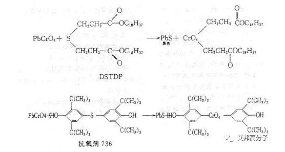铬黄颜料或钼铬红中铅成分与抗氧剂如硫代二硬脂酸酯DSTDP反应
