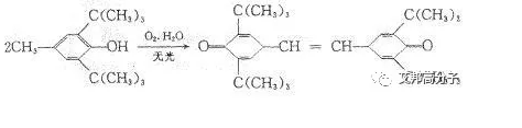 酚类稳定剂的自动氧化,是促进白色或浅色制品色变的重要因素,这种色变在国外常称为“Pinking”(泛红),它是由诸如BHT抗氧剂(2-6-二叔丁基-4-甲基苯酚)氧化产物偶合,并形如3,3′,5,5′一均二苯乙烯醌淡红色反应产物,这种变色仅在有氧和水以及无光的情况下发生,曝置在紫外光下,淡红的均二苯乙烯醌迅速分解成黄色的单环产物。