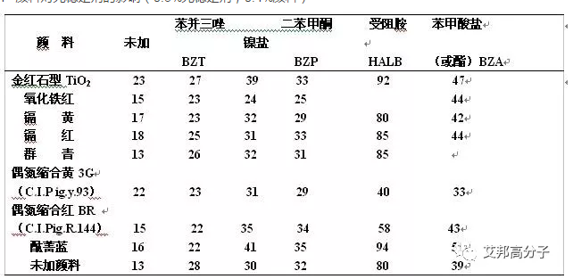 颜料对有加抗氧剂(酚类)PP的影响大小参见表3。