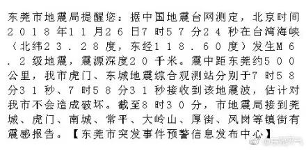 刚刚,东莞地震局发布提醒,据中国地震台网测定,北京时间11月26日07时57分在台湾海峡(北纬23.28度,东经118.60度)发生6.2级地震,震源深度20千米。震中距东莞约500公里,我市虎门、东城地震综合观测站分别于7时58分31秒、7时58分31秒接收到该地震波,估计对我市不会造成破坏。截至8时30分,市地震局接到莞城、虎门、南城、常平、大岭山、厚街、凤岗等镇街有震感报告。