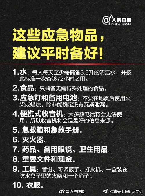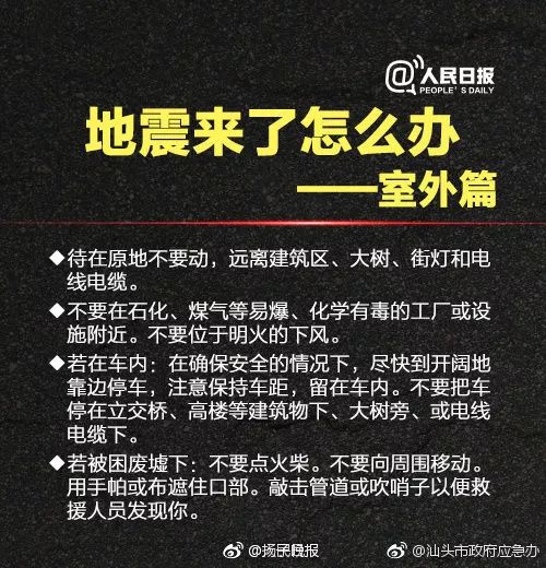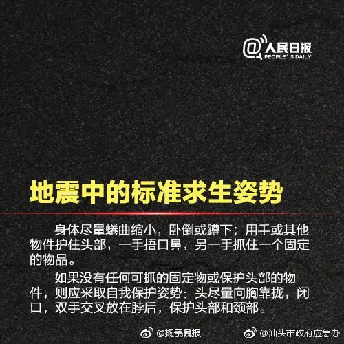 人民日报发布的《最权威地震逃生手册》,当地震发生时,如果您在床上,应该待在那里不要动,抓紧枕头保护头部;如果您在室内应该利用承重墙为掩护,双手抓牢固定物体。如果您在室外,应远离建筑区、大树、街灯和电线电缆。