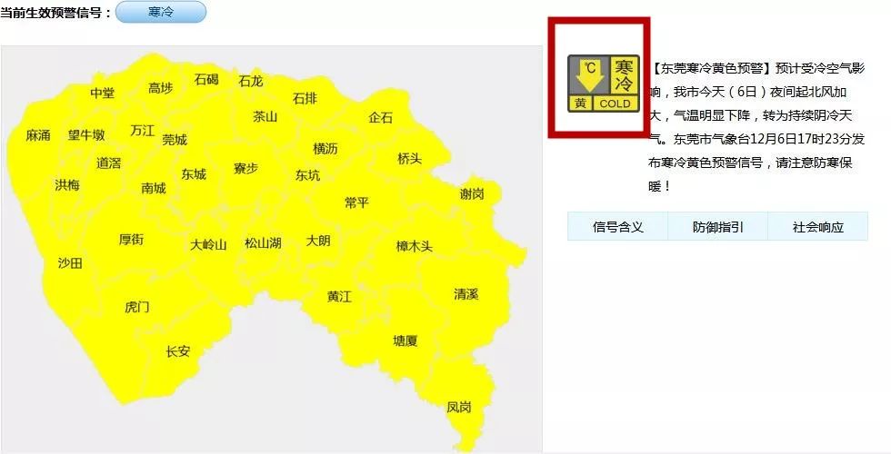 【东莞寒冷黄色预警】预计受冷空气影响,我市6日夜间起北风加大,气温明显下降,转为持续阴冷天气。东莞市气象台12月6日17时23分发布寒冷黄色预警信号,请注意防寒保暖!