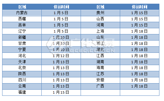 内蒙古,西藏,吉林,辽宁等地1月5日停运,新疆,甘肃,宁夏等地1月10日停运。河北1月12日停运,天津,北京,陕西,四川,云南等地1月13日停运。福建,贵州,山西,河南等地1月15日停运。上海,山东,浙江,湖北,江西,湖南,海南,江苏,安徽,广西等地1月18日停运。