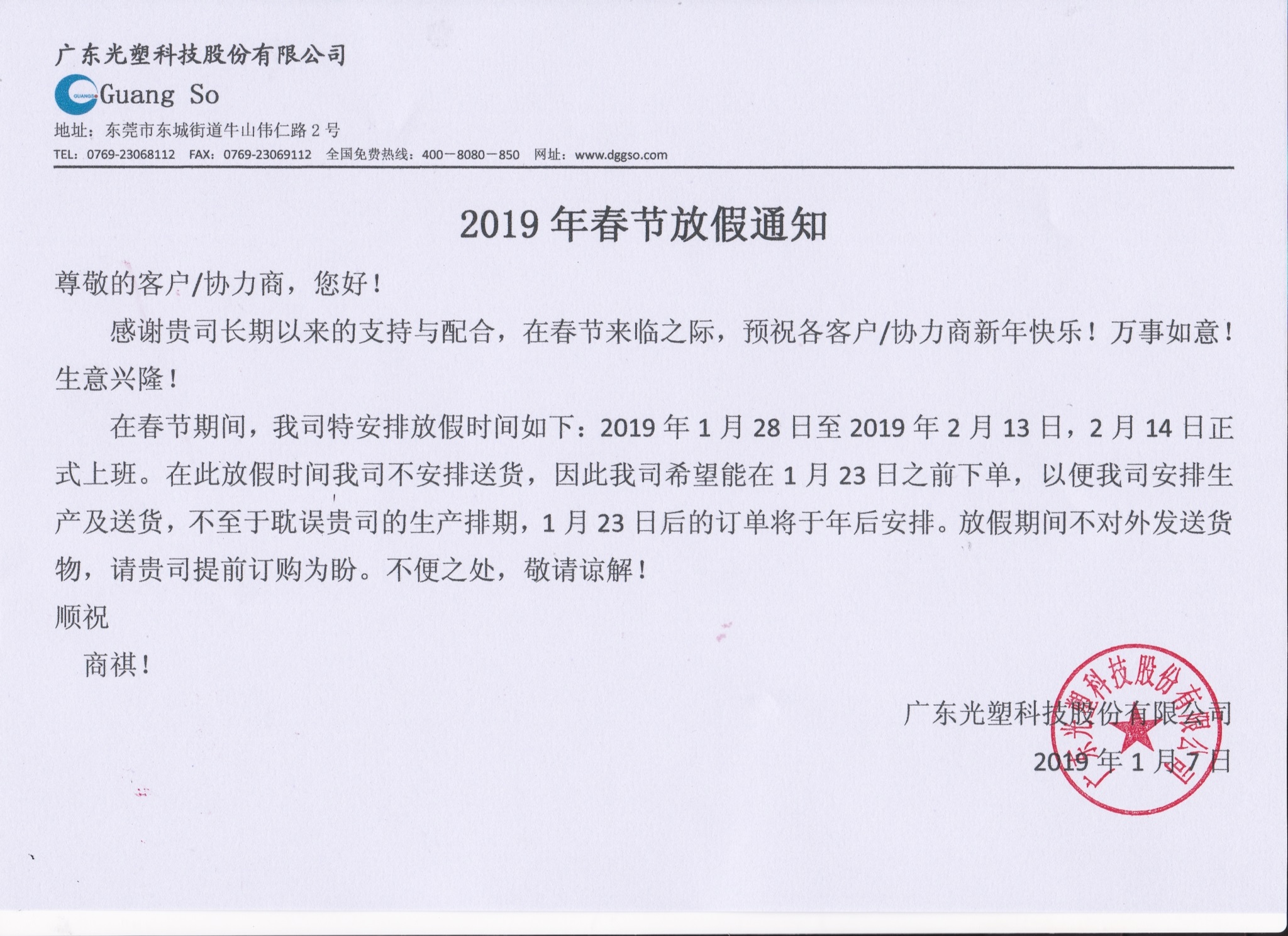 尊敬的客户/协力商,您好!感谢贵司长期以来的支持与配合,在春节来临之际,预祝各客户/协力商新年快乐!万事如意!生意兴隆!在春节期间,我司特安排放假时间如下:2019年1月28日至2019年2月13日,2月14日正式上班。在此放假时间我司不安排送货,因此我司希望能在1月23日之前下单,以便我司安排生产及送货,不至于耽误贵司的生产排期,1月23日后的订单将于年后安排。放假期间不对外发送货物,请贵司提前订购为盼。不便之处,敬请谅解!