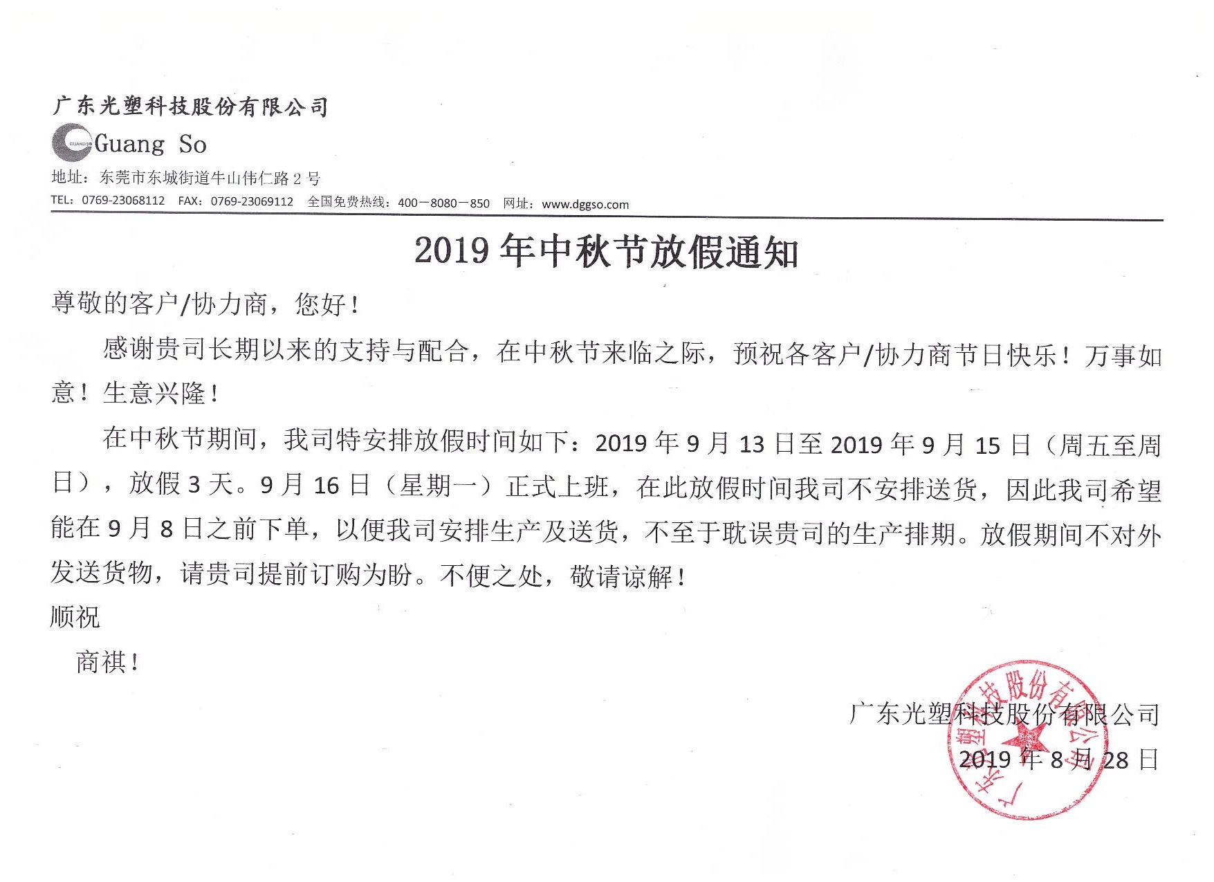 在中秋节期间,我司特安排放假时间如下:2019年9月13日至2019年9月15日(周五至周日),放假3天。9月16日(星期一)正式上班,在此放假期间我司不安排送货,因此我司希望能在9月8日之前下单,以便我司安排生产及送货,不至于耽误贵司的生产排期。放假期间不对外发送货物,请贵司提前订购为盼。不便之处,敬请谅解!