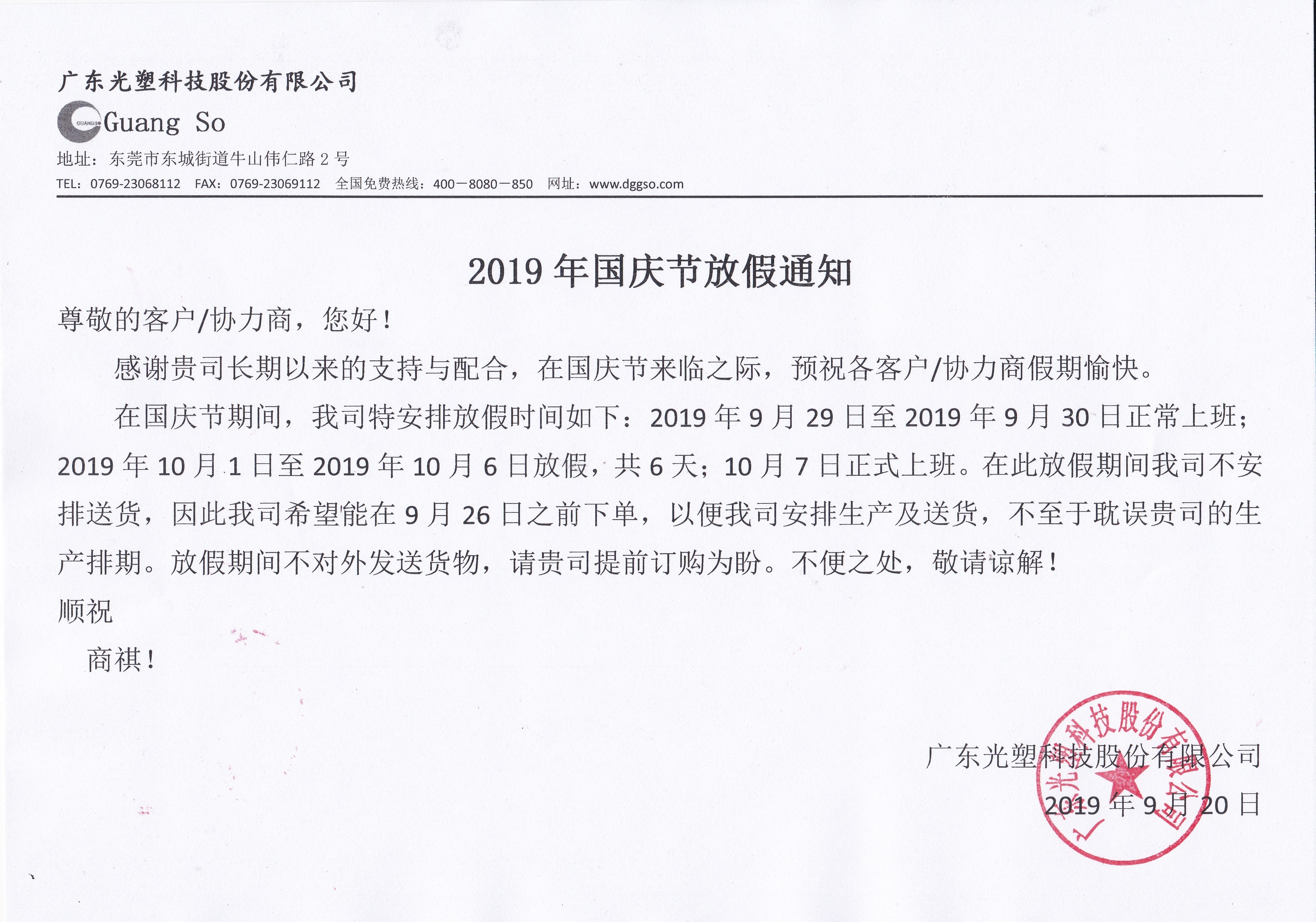 感谢贵司长期以来的支持与配合,在国庆节来临之际,预祝各客户/协力商假期愉快。在国庆节期间,我司特安排放假时间如下:2019年9月29日至2019年30日正常上班;2019年10月1日至2019年10月6日放假,共6天;10月7日正式上班。在此放假期间我司不安排送货,因此我司希望能在9月26日之前下单,以便我司安排生产及送货,不至于耽误贵司的生产排期。放假期间不对外发送货物,请贵司提前订购为盼。不便之处,敬请谅解!