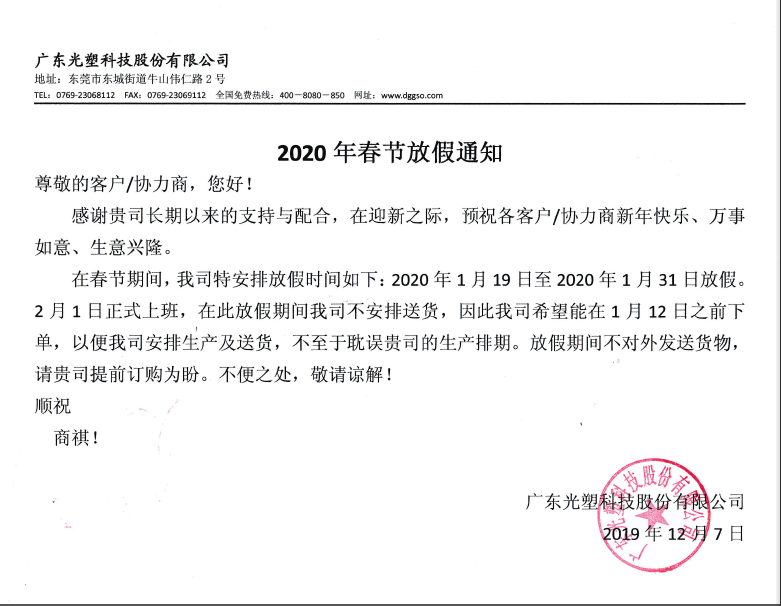 在春节期间,我司特安排放假时间如下:2020年1月19日至2020年1月31日放假。2月1日正式上班,在此放假时间我司不安排送货,因此我司希望能在1月12日之前下单,以便我司安排生产及送货,不至于耽误贵司的生产排期。放假期间不对外发送货物,请贵司提前订购为盼。不便之处,敬请谅解!