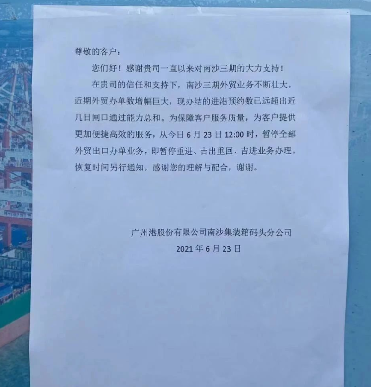 据壹航运独家最新获悉:今天(6月23日)上午,广州南沙集装箱码头发布紧急通知: 从今日(6月23日)12:00时起,暂停全部外贸出口办单业务