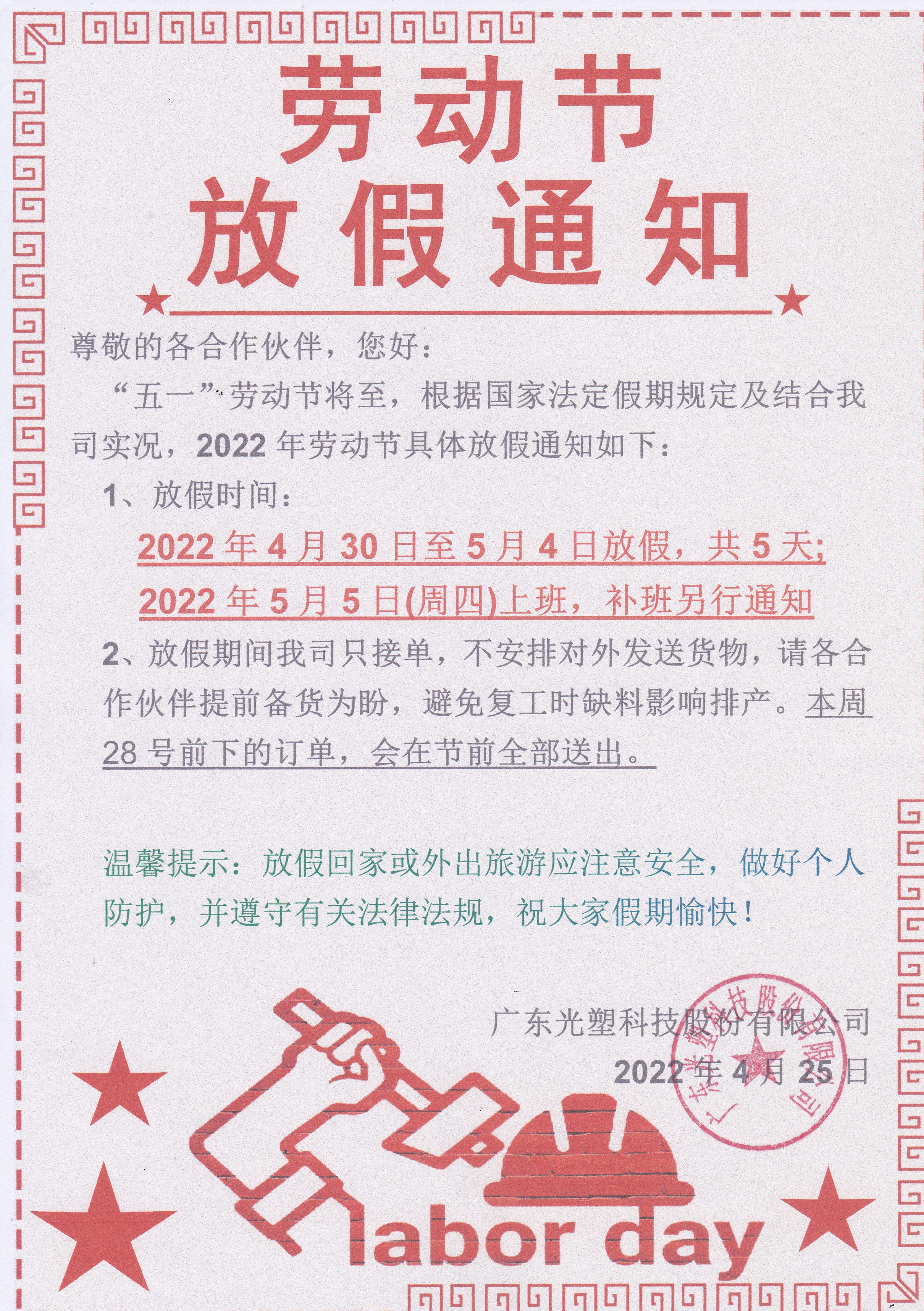 文章标题:5.1劳动节放假通知